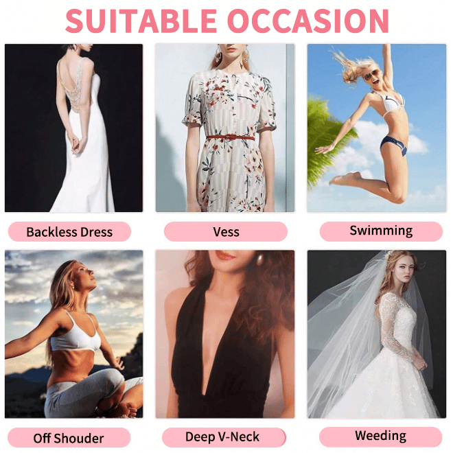 The sticky bra is a deep V-shaped design that helps push your chest and only need a little pull, it will give you a complete and sexy cleavage. It is better to show off your beautiful chest curve, let you become the focus of everyone.