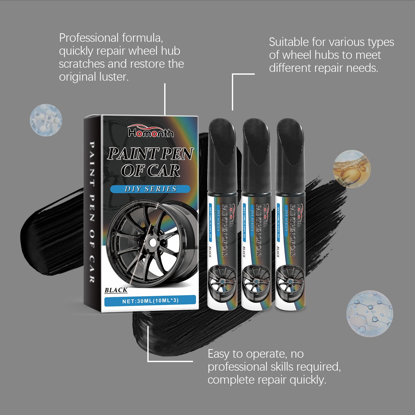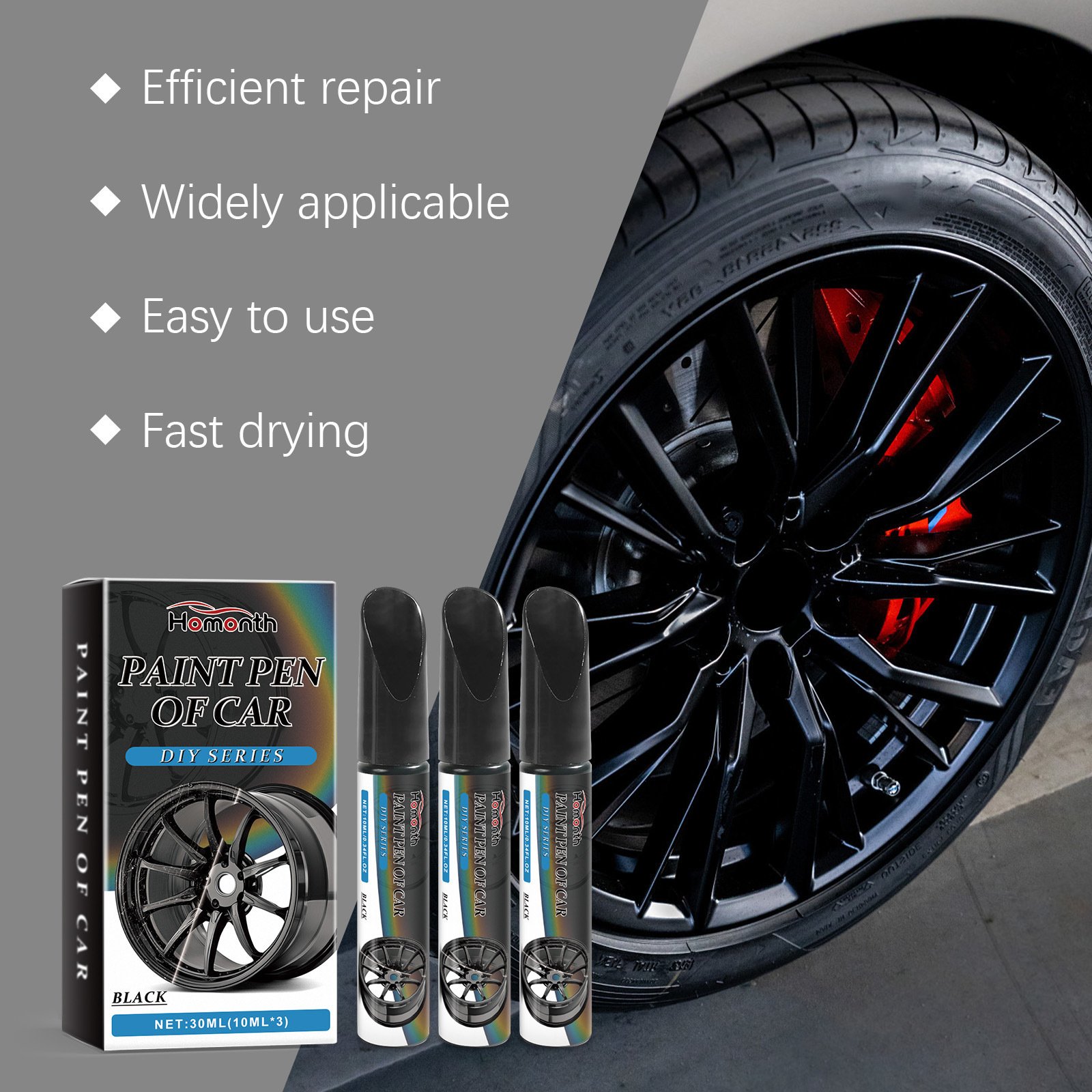 - [Easy to Operate] Clean and remove surface grease, then shake to mix thoroughly, according to the depth of damage, use multiple layers of paint to repair minor scratches, and it will take only 10 minutes to dry,No need to remove the wheel.