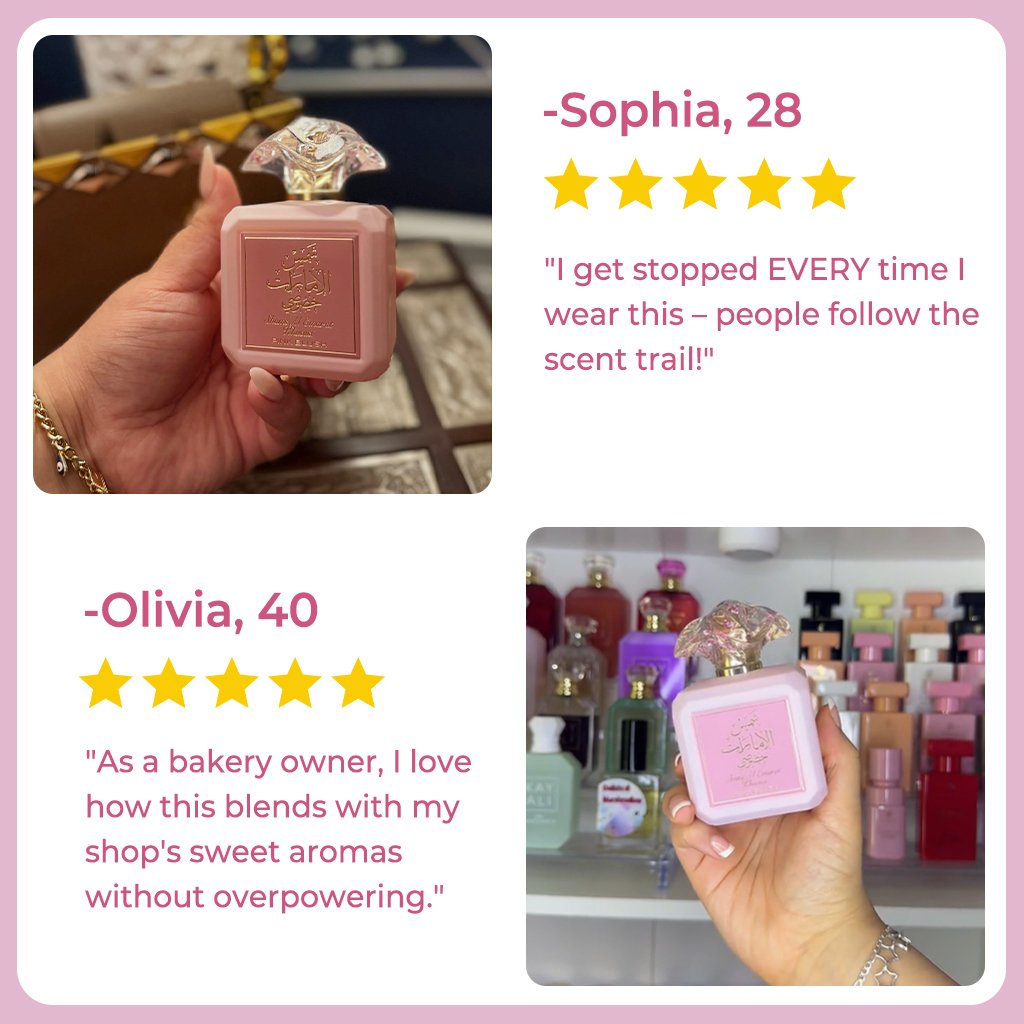 Experience the ultimate fragrance fusion! Pink Blush Shams Al Emarat Khususi that captures sweetness, warmth, and timeless elegance. The scent begins with a vibrant blend of raspberry, nectarine, and crisp apple, offering a fresh and fruity opening.