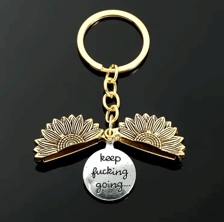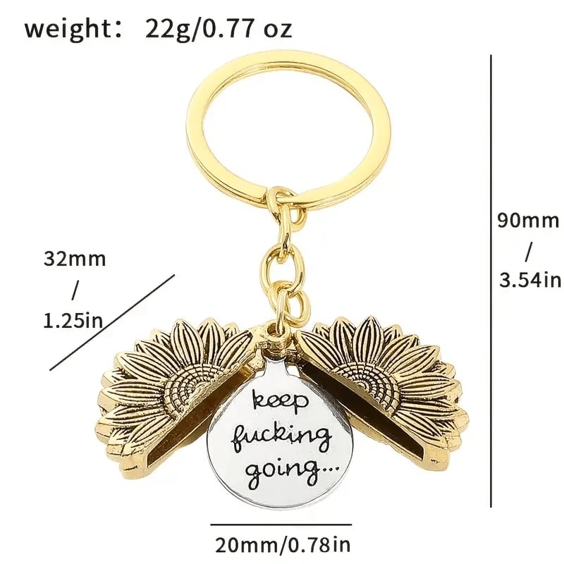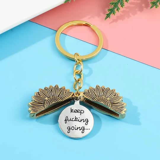- Unique Design: Sunflower locket keychain engraved with "keep fucking going", a ideal inspirational gifts for women, teen girls; Simple and funny words remind her to keep going forever