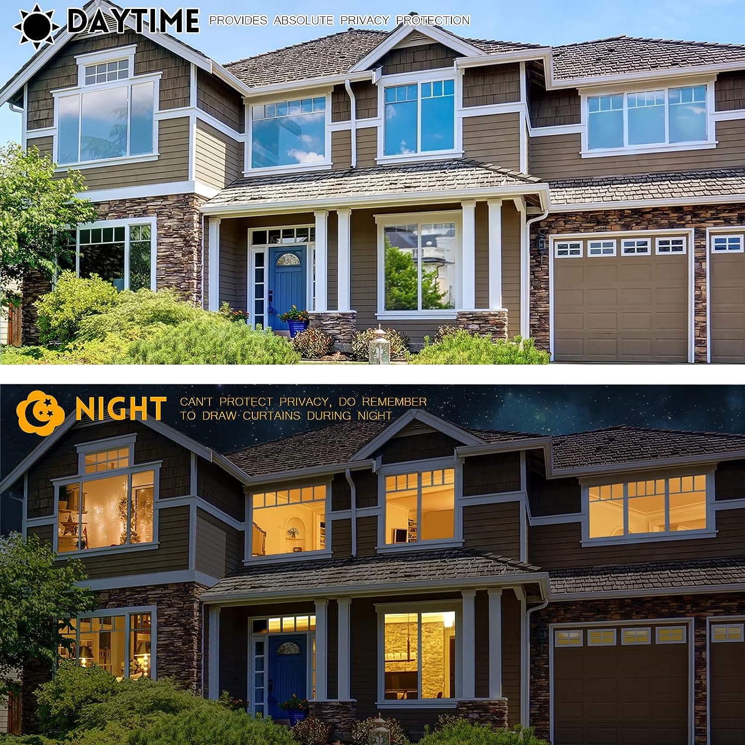 This one way window film provides superb privacy during daytime, the mirror reflection of privacy control window film allows others to not see any interiors from the outside, effectively protecting your private space. But when inside light is stronger than outside, loss of light difference, such as the lights turning on, the mirror effect will disappear and will be seen from the outside. So at night with this mirror tint, it is necessary to draw the curtains.